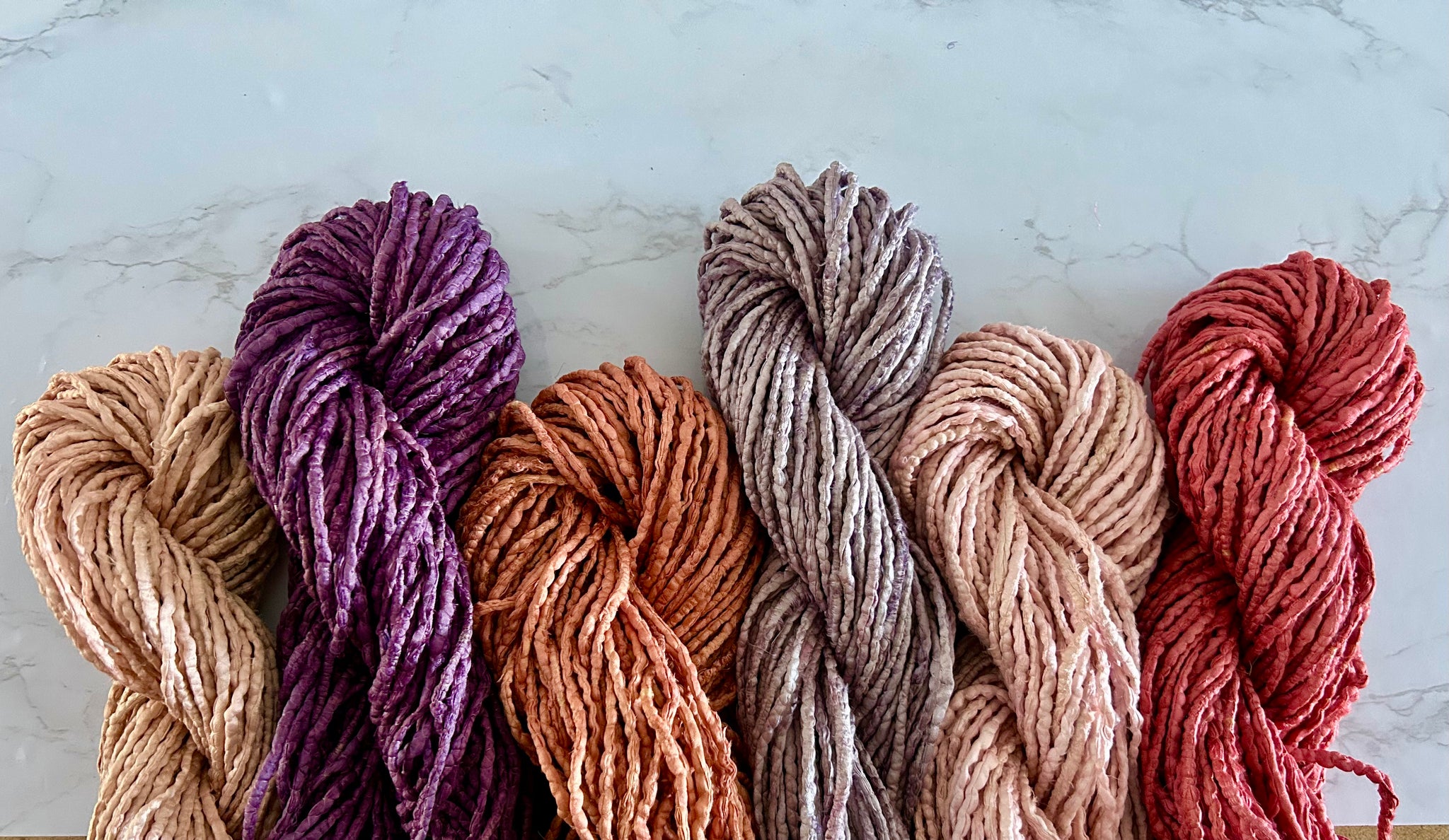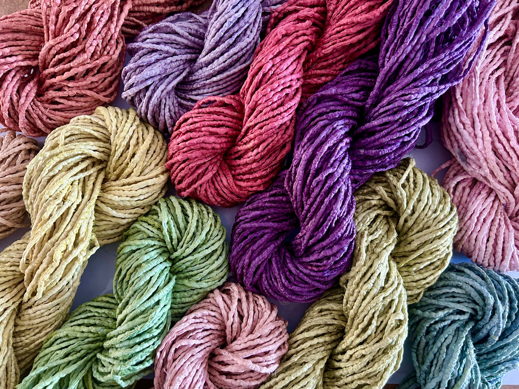This silk twine has already seen a productive life in India and comes to me from my longtime supplier in India, who gathers and processes the used saris for me which I then carefully hand-dye in single batches with my all-natural dyes to a beautiful range of colour.